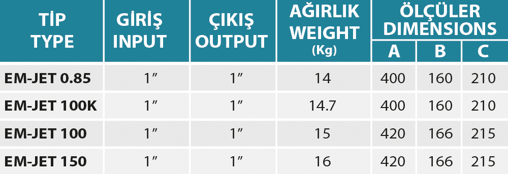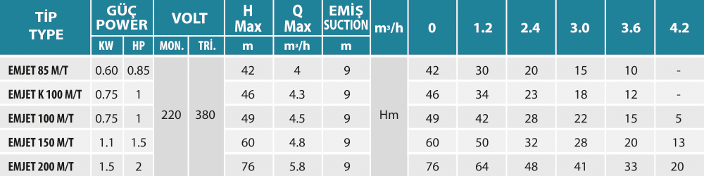 Empo Pompa’nın EM-JET Serisi, 9 metreye kadar güçlü emiş kabiliyetiyle öne çıkan, sessiz ve güvenilir çalışması sayesinde hem bireysel hem de hafif ticari uygulamalar için ideal olan kendinden emişli jet pompa modelidir. Özellikle hava kabarcıklı veya hava karışımı içeren sularda dahi stabil emiş kabiliyeti ile kullanıcıya kesintisiz bir çözüm sunar.
