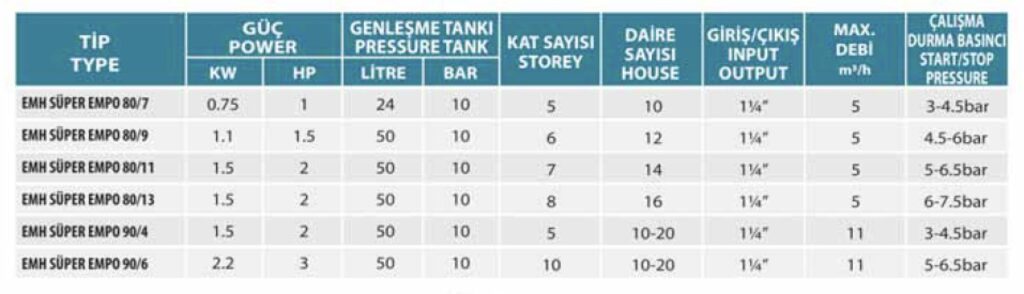 Empo Pompa’nın Süper Empo Serisi – EMH Serisi hidroforları, farklı kapasite ve uygulamalara yönelik olarak geliştirilmiş, sessiz çalışan, verimli, ve yüksek kaliteli hidrofor sistemleridir. Gelişmiş mühendislik ve sağlam malzeme yapısıyla, hem konut hem de endüstriyel uygulamalarda kesintisiz su basıncı sağlar. Tüm modellerde titreşim önleyici taban takozları, kollektörlü şase yapısı ve otomasyon sistemlerine uyumlu çalışma standarttır.